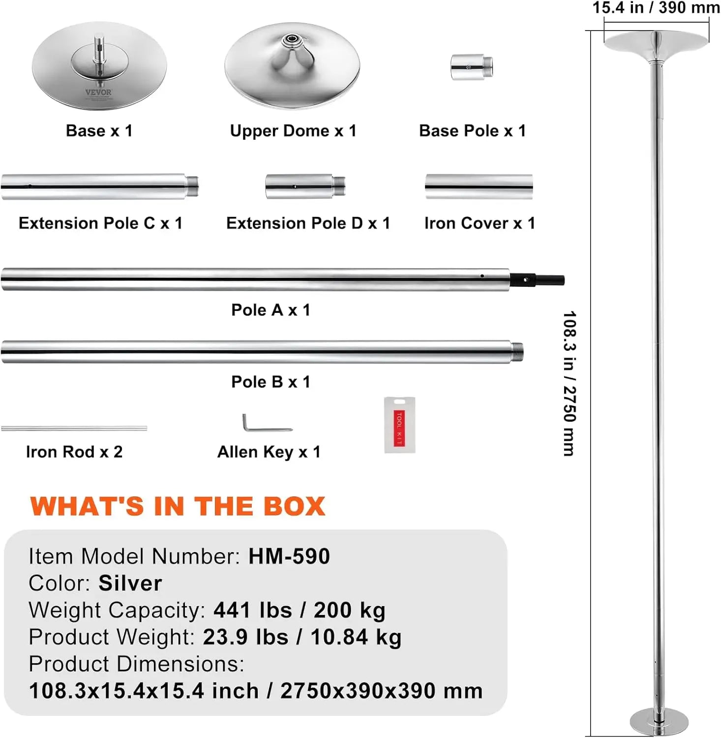 - Easy to Install: The heavy-duty dancing pole includes a standard dance pole and extension rods to ensure easy assembly, allowing you to adjust the pole to your desired length according to different ceiling heights. The pole is easy to set up and take down, with no ceiling fixture needed, and comes with an installation manual, allowing for flexible height adjustments: 85-106 inches (2163-2700mm).
