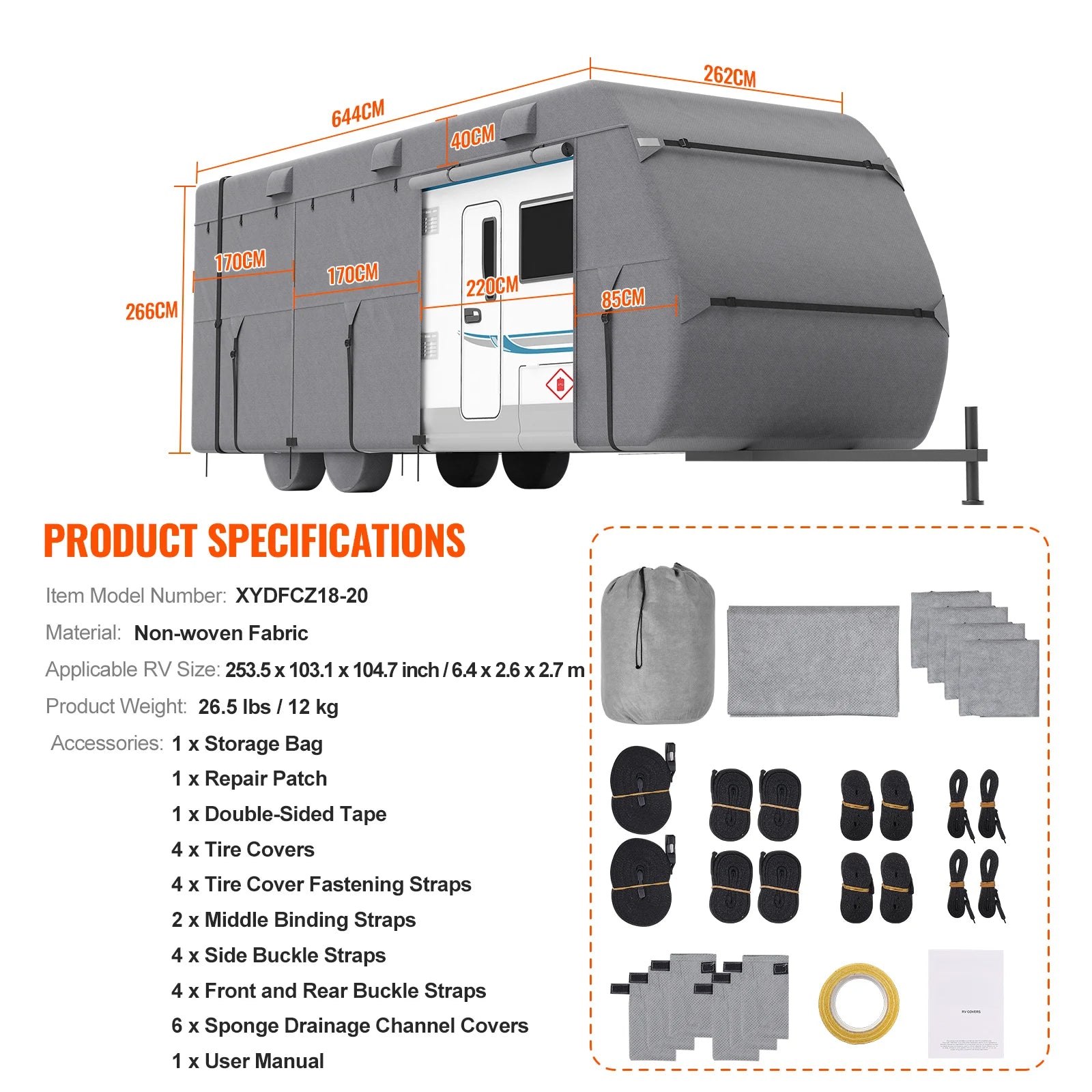 - Fit 18-20 ft RVs: This travel trailer cover measures 253.5"L x 103.1"W x 104.7"H, providing a perfect fit for 18'-20' Class-A trailers. The set also includes 4 tire covers. For proper installation, please measure your RV accurately, including the bumper, ladder, and spare tire (excluding hitch). We provide a variety of sizes to ensure the perfect fit for your RV.